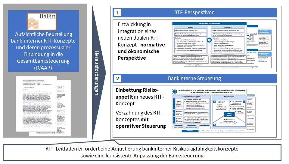 Im Zuge der europaweiten Harmonisierung der ICAAP-Verfahren konkretisiert die BaFin ihre Anforderungen an Risikotragfähigkeitskonzepte. Der neue RTF-Leitfaden erfordert eine Adjustierung von bankinternen Risikotragfähigkeitskonzepten sowie eine konsistente Anpassung der Banksteuerung.