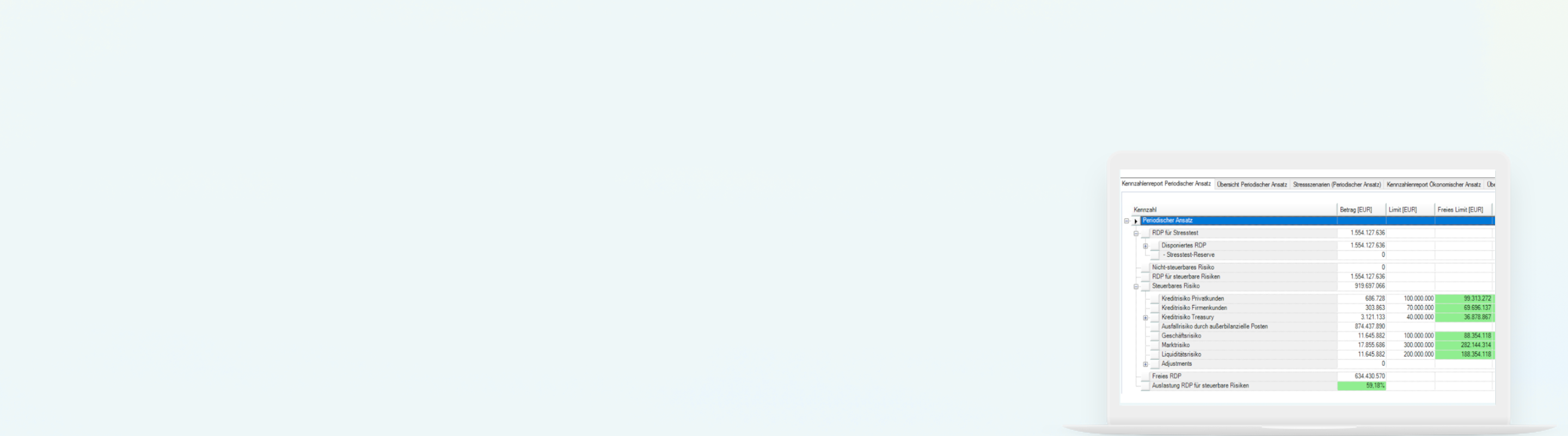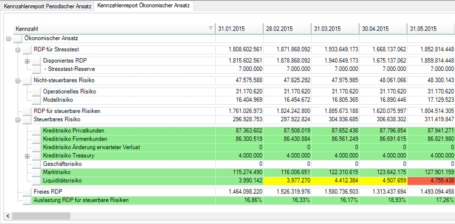• Ökonomischer Ansatz: Flexible Konfiguration der RDP- und Risikoberechnung sowie Definition von Stressszenarien für Szenario- und Sensitivitätsanalysen